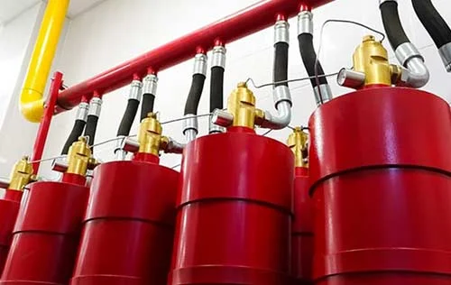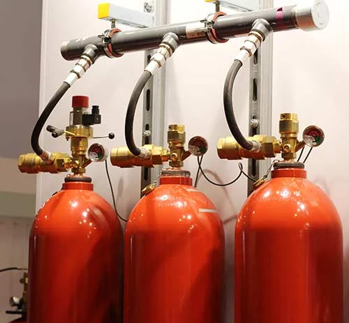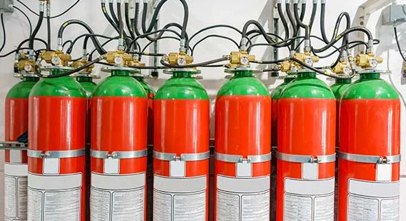 A ve B tipi yangınlarda ortamı soğutan, oksijen miktarını azaltan, alevleri söndüren otomatik gazlı söndürme sistemleri.
